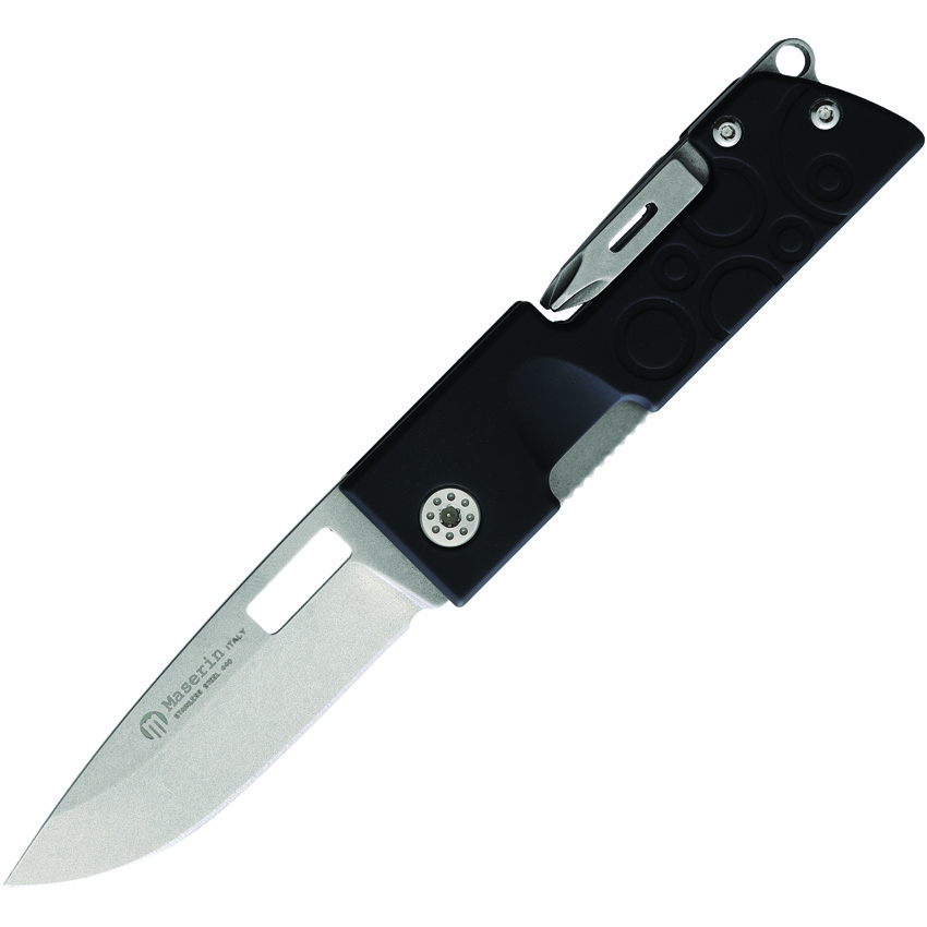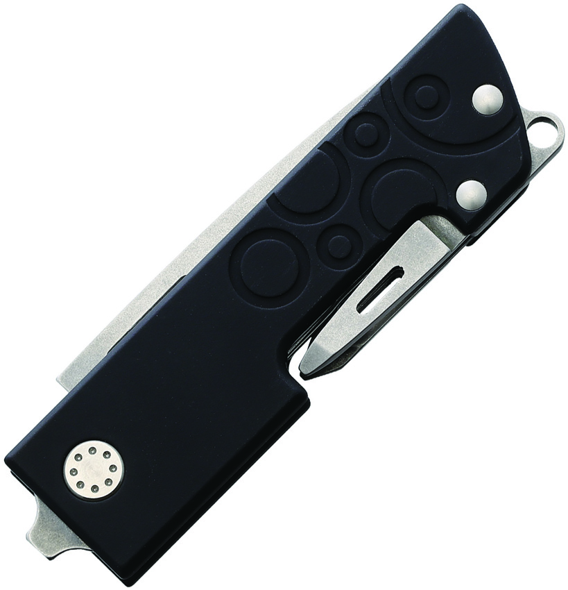 3.5″ (8.89cm) closed. Stonewash finish 440 stainless blade. Black anodized aluminum handle. Tools include: Flat head screwdriver l Keyring l Phillips screwdriver l Awl l Reamer with sewing eye. Black nylon belt sheath. Boxed.
