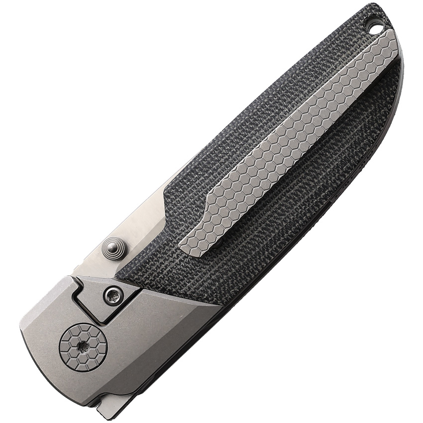 4.13″ (10.49cm) closed. 3″ (7.62cm) satin finish Bohler M390 stainless blade. Black canvas micarta handle. Titanium bolster(s). Extended tang. Thumb stud. Lanyard hole. Pocket clip. Zippered storage case.
