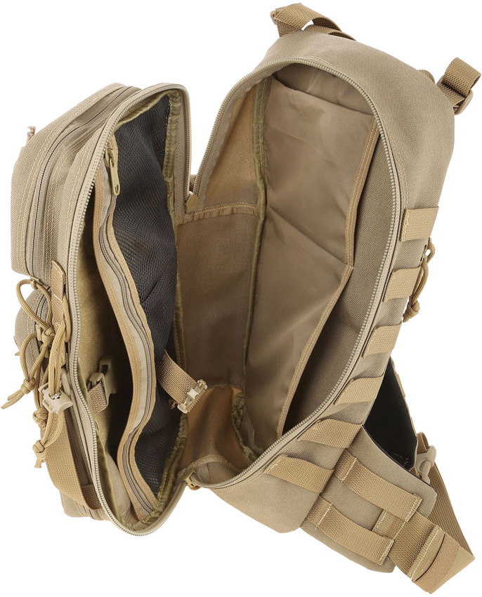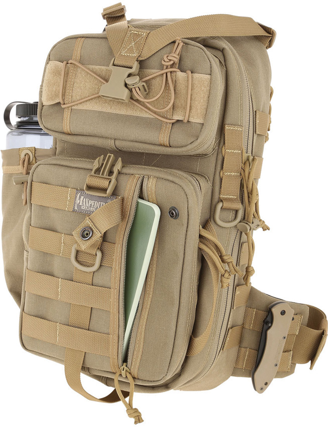 Legacy Series. Main compartment measures 16.5″ x 8.5″ x 3″. Approximate capacity 618 cubic inches. Main compartment and hydration compartment can accept CCW accessories. Shoulder strap designed to go over left shoulder for better weapon shouldering. Water bottle pocket sized to fit 32oz Nalgene bottle. Compatible with 100oz hydration reservoir. Theft deterrent devices built-in to capture zipper pulls. PALS modular webbing throughout for attaching accessories. Top and side handles. Lon thread (stronger than ordinary industry standard nylon thread). #AS-100 high grade closed-cell foam padding material for superior shock protection. High tensile strength nylon webbing. #10 high strength zippers and zipper tracks. UTX-Duraflex nylon buckles for low sound closures. Seen in the movie “Iron Man 3”. Tony Stark, played by Robert Downey Jr., carried his bug-out gear in his Maxpedition #0431 Sitka Gearslinger in this summer’s worldwide mega-blockbuster. Note: Items shown with gear bag are for illustration purposes only and are not included. Color: Khaki.