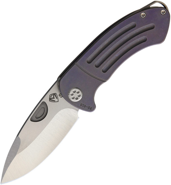 This Theseus model as a Purple anodized titanium handle and frame with a satin finish S35VN stainless drop point blade.