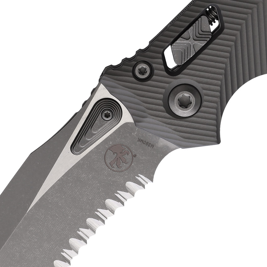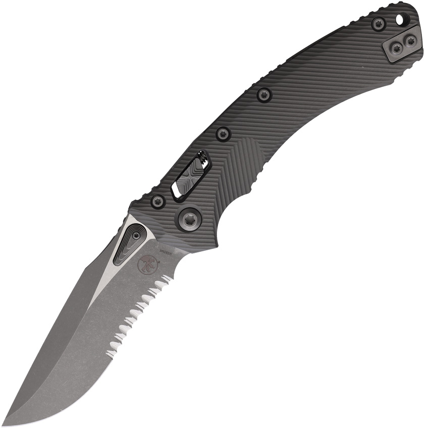5.38″ (13.67cm) closed. 4″ (10.16cm) Apocalyptic finish partially serrated Bohler M390MK stainless blade. Gray fluted aluminum handle. Pocket clip. Lanyard hole. Thumb stud. Microtech item # 137RL-11APFLNC. Boxed.