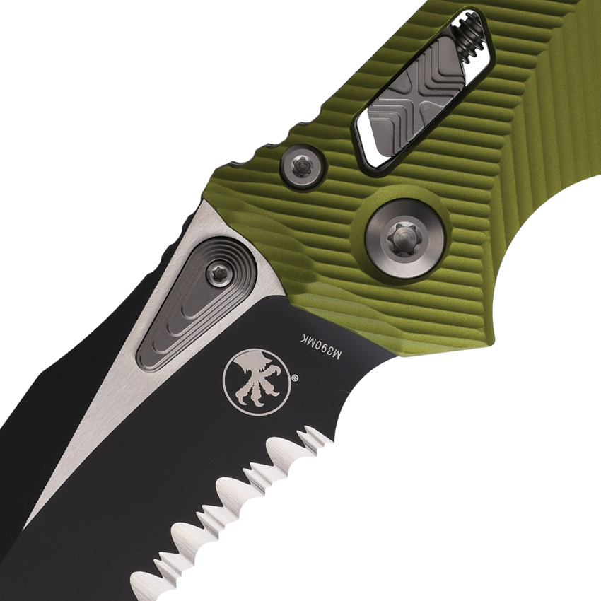 5.38″” (13.67cm) closed. 4″” (10.16cm) two-tone finish partially serrated Bohler M390MK stainless blade. OD green aluminum handle. Pocket clip. Lanyard hole. Unique thumb stud opener with ball bearing pivot. Microtech item #137RL-2FLOD. Boxed.