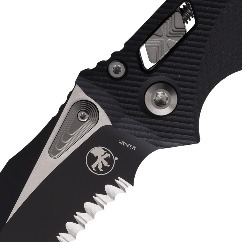 - Two-tone finish partially serrated Bohler M390MK stainless blade