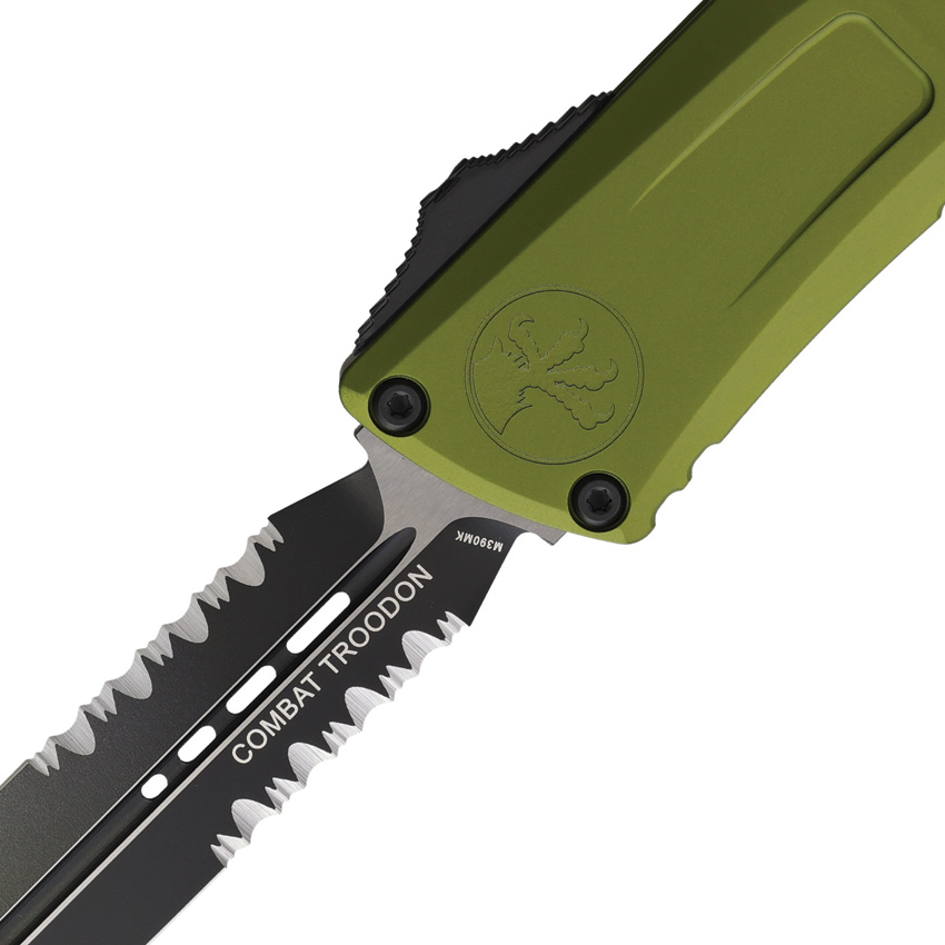 Automatic opening. 5.38″ (13.67cm) closed. 4″ (10.16cm) two-tone finish partially serrated Bohler M390MK stainless dagger blade. OD green aluminum handle. Pocket clip. Lanyard hole. Glass breaker. Double edge blade. Boxed.
