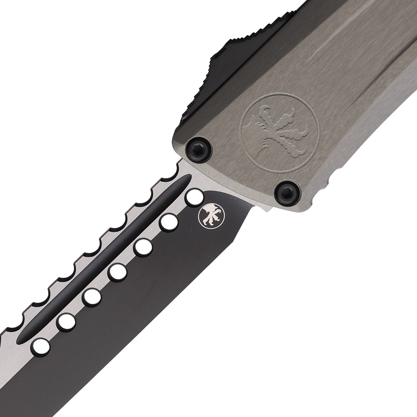 Automatic opening. 5.5″ (13.97cm) closed. 4″ (10.16cm) Apocalyptic finish premium steel tanto blade. Gray aluminum handle. Pocket clip. Lanyard hole. Glass breaker. Boxed.
