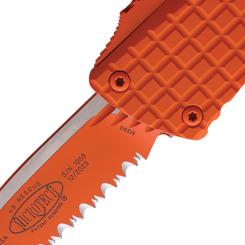 Microtech Combat Troodon Frag HS Rescue OTF Automatic Knife Orange, a versatile tool designed for everyday carry. This larger version of the popular Troodon model boasts a longer blade, beefier handle, and more powerful action. Its slim and comfortable handle, super-steel blade, and one-handed operation make it a reliable companion for any situation.