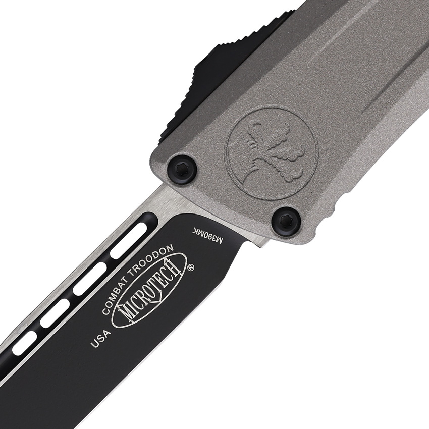Automatic opening. 5.5″ (13.97cm) closed. 4″ (10.16cm) two-tone finish premium steel blade. Gray titanium handle. Pocket clip. Lanyard hole. Glass breaker. Boxed.