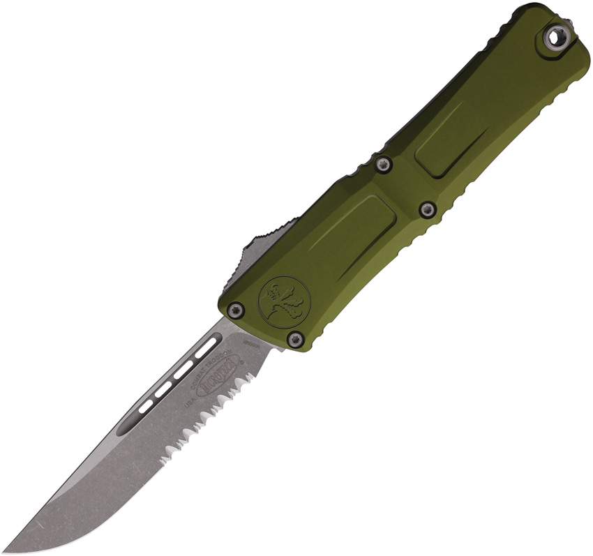 Automatic opening. 5.38″ (13.67cm) closed. 4″ (10.16cm) Apocalyptic finish partially serrated premium steel blade. OD green aluminum handle. Pocket clip. Lanyard hole. Glass breaker. Boxed.