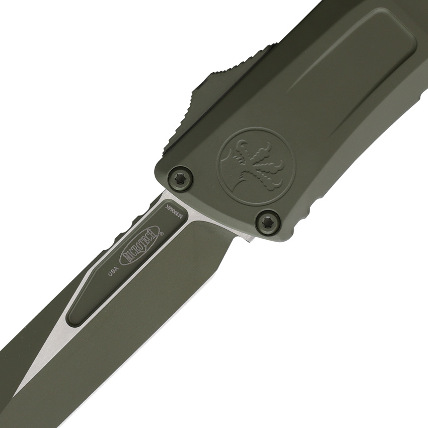 Automatic opening. 5.38″ (13.67cm) closed. 4″ (10.16cm) Bohler M390MK stainless bowie blade. Aluminum handle. Pocket clip. Lanyard hole. Glass breaker. OD green Cerakote blade and handle. Boxed.