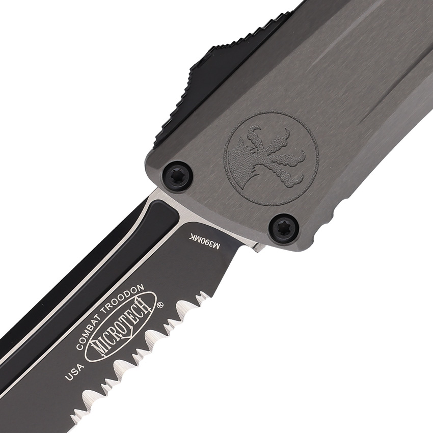 The Microtech Knives Auto Combat Troodon T/E GenIII is a testament to Microtech’s commitment to quality and innovation. The knife features a 4″” blade made from Bohler M390MK stainless steel, known for its excellent edge retention and corrosion resistance. The blade’s tanto style and partial serration make it versatile for a variety of cutting tasks.