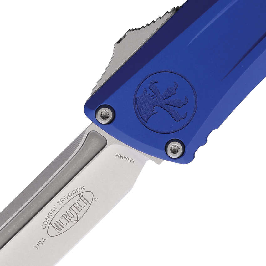 Automatic opening. 5.5″ (13.97cm) closed. 4″ (10.16cm) stonewash finish Bohler M390MK stainless tanto blade. Navy aluminum handle. Pocket clip. Lanyard hole. Glass breaker. Boxed.