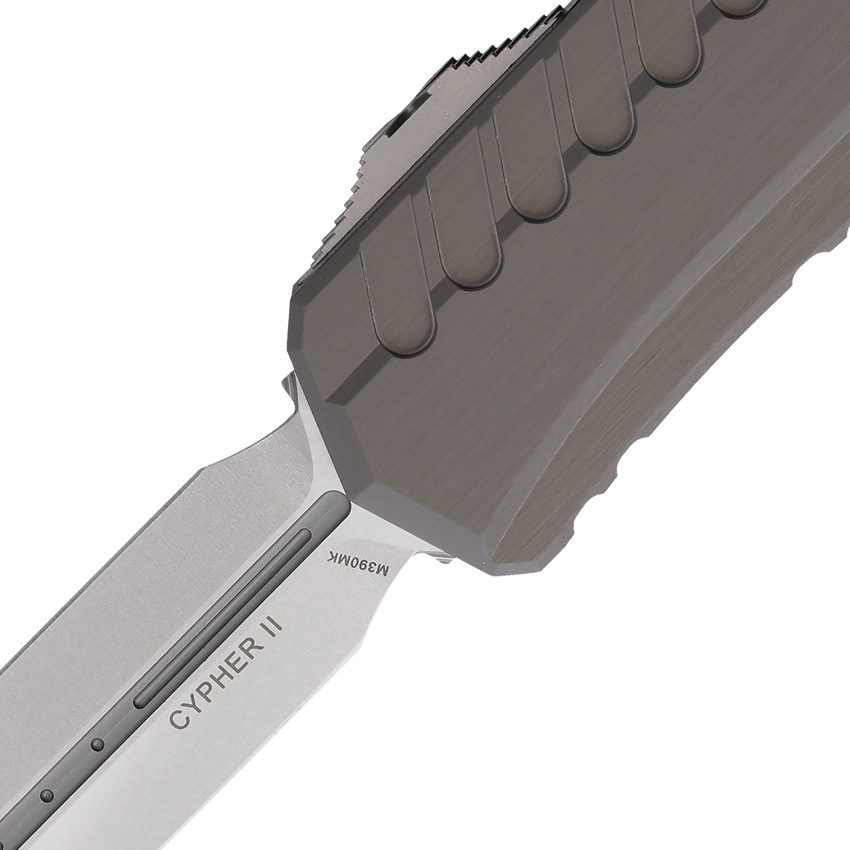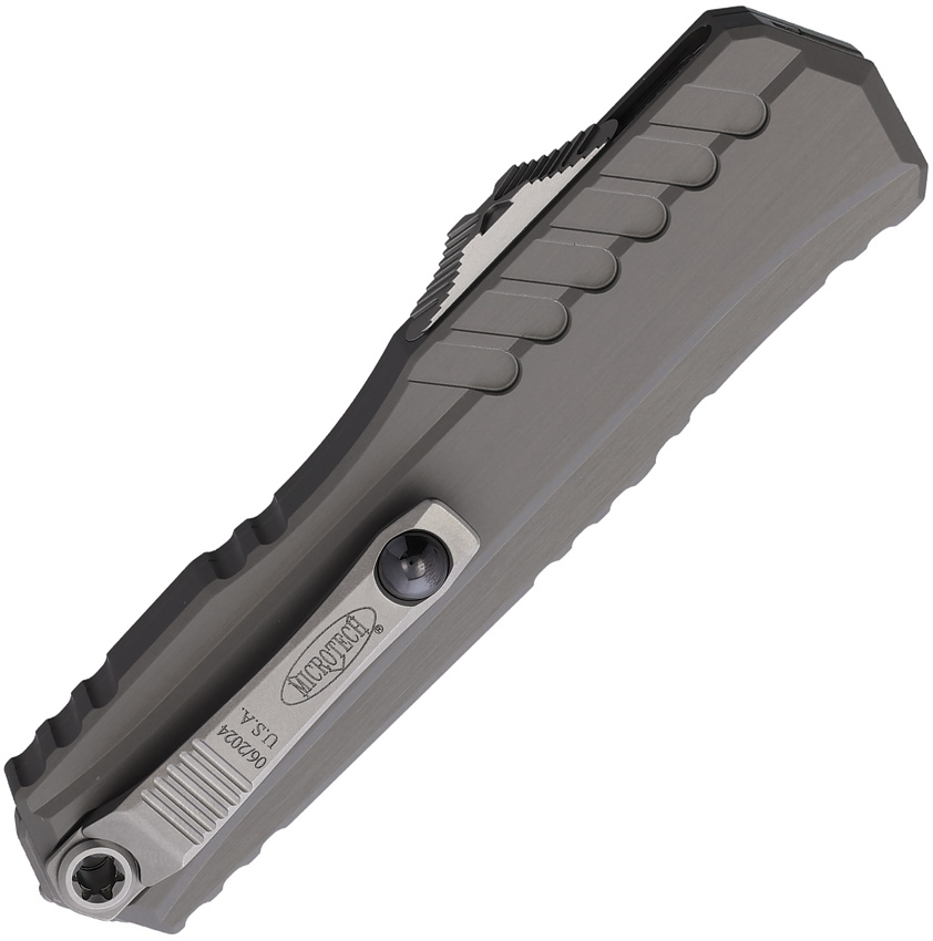 Automatic opening. 5″ (12.7cm) closed. 3.5″ (8.89cm) stonewash finish double edge premium steel blade. Gray aluminum handle. Pocket clip. Lanyard hole. Glass breaker. Boxed.