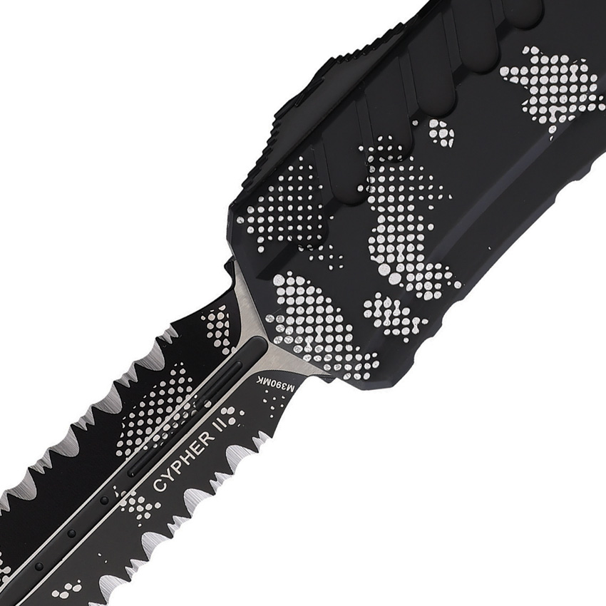 Automatic opening. 5″ (12.7cm) closed. 3.5″ (8.89cm) partially serrated Bohler M390MK stainless dagger blade. Aluminum handle. Pocket clip. Lanyard hole. Glass breaker. Pixel camo blade and handle. Boxed.