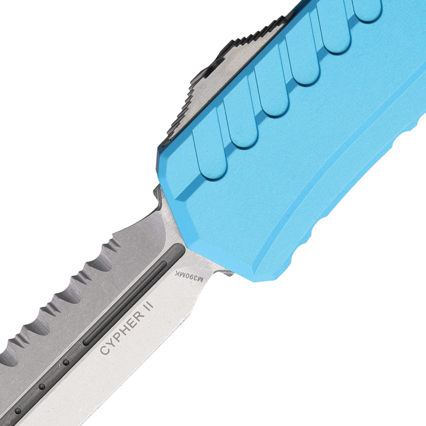 The Auto Cypher II features a 3.5″” stonewash finish serrated Bohler M390MK stainless dagger blade, offering exceptional cutting power and edge retention. The turquoise aluminum handle is both stylish and functional, providing a secure grip for safe handling. The knife also includes a pocket clip, lanyard hole, and glass breaker, making it a versatile tool for any situation.