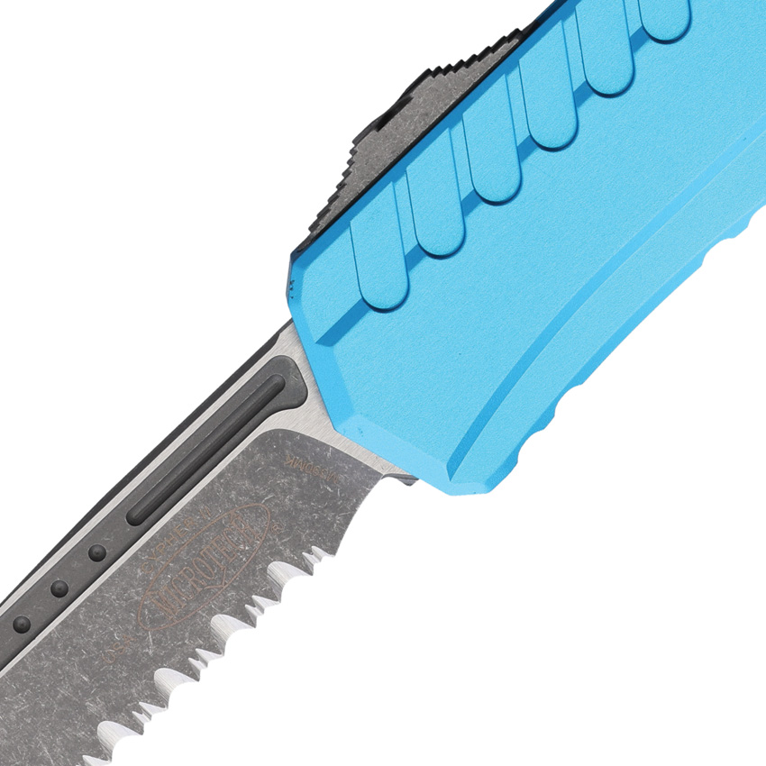 Automatic opening. 5″” (12.7cm) closed. 3.5″” (8.89cm) Apocalyptic finish partially serrated Bohler M390MK stainless Wharncliffe blade. Turquoise aluminum handle. Pocket clip. Lanyard hole. Glass breaker. Boxed.