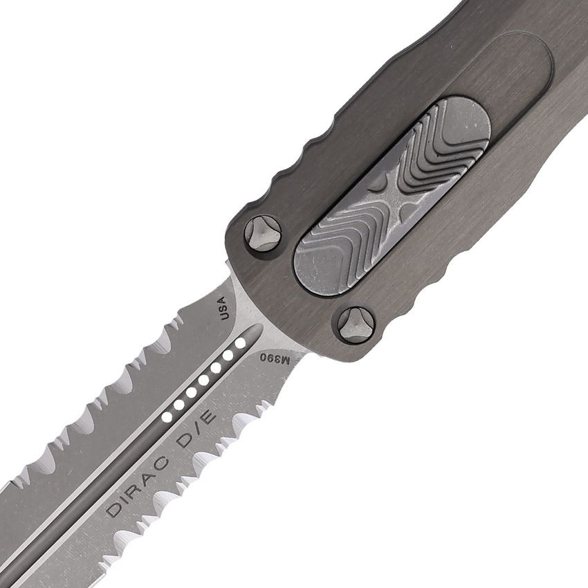 Microtech Dirac D/E OTF Automatic Knife, a high-quality everyday carry tool designed for durability and precision. This knife is a testament to Microtech’s commitment to superior craftsmanship and functionality. Its unique design features a thumb slide on the face of the handle, a first for Microtech, enhancing ease of use and control.