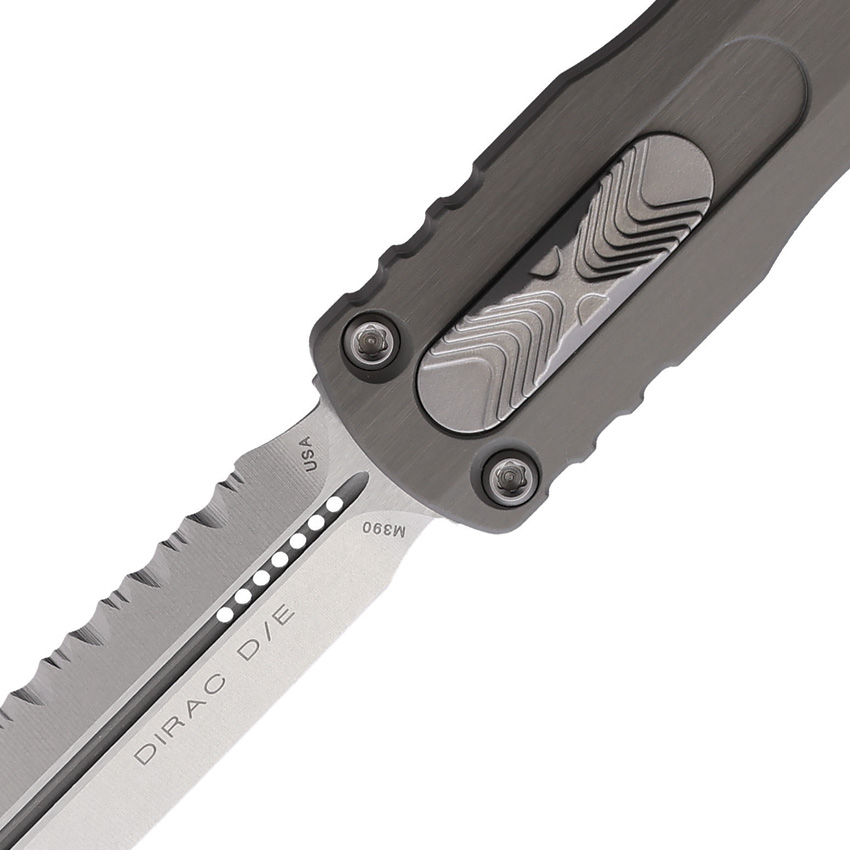 Automatic opening. 4.38″ (11.13cm) closed. 3″ (7.62cm) stonewash finish serrated Bohler M390 stainless dagger blade. Gray aluminum handle. Glass breaker. Pocket clip. Lanyard hole. Boxed.
