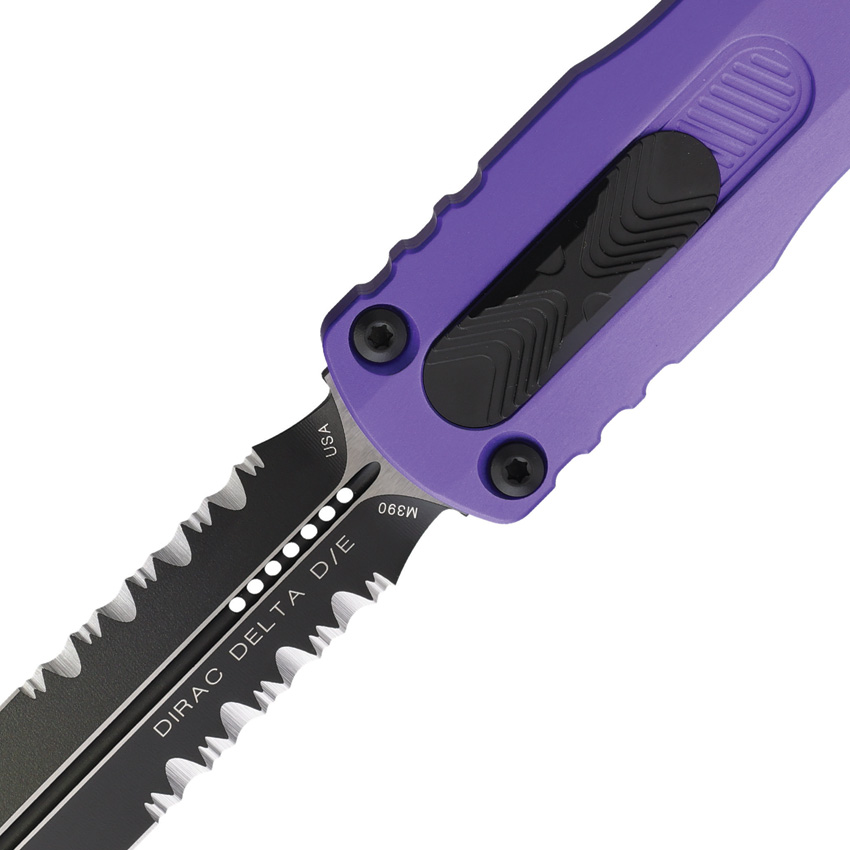 Automatic opening. 5.63″ (14.3cm) closed. 3.79″ (9.63cm) two-tone finish partially serrated Bohler M390MK stainless dagger blade. Purple aluminum handle. Glass breaker. Pocket clip. Lanyard hole. Double edge blade. Boxed.