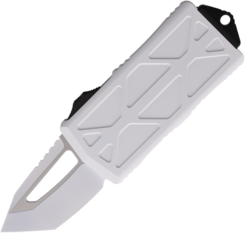 Automatic opening. 3.63″ (9.22cm) closed. 1.94″ (4.93cm) white finish premium steel tanto blade. White aluminum handle. Lanyard hole. Pocket clip. Pocket clip doubles as money clip. California legal. Boxed.