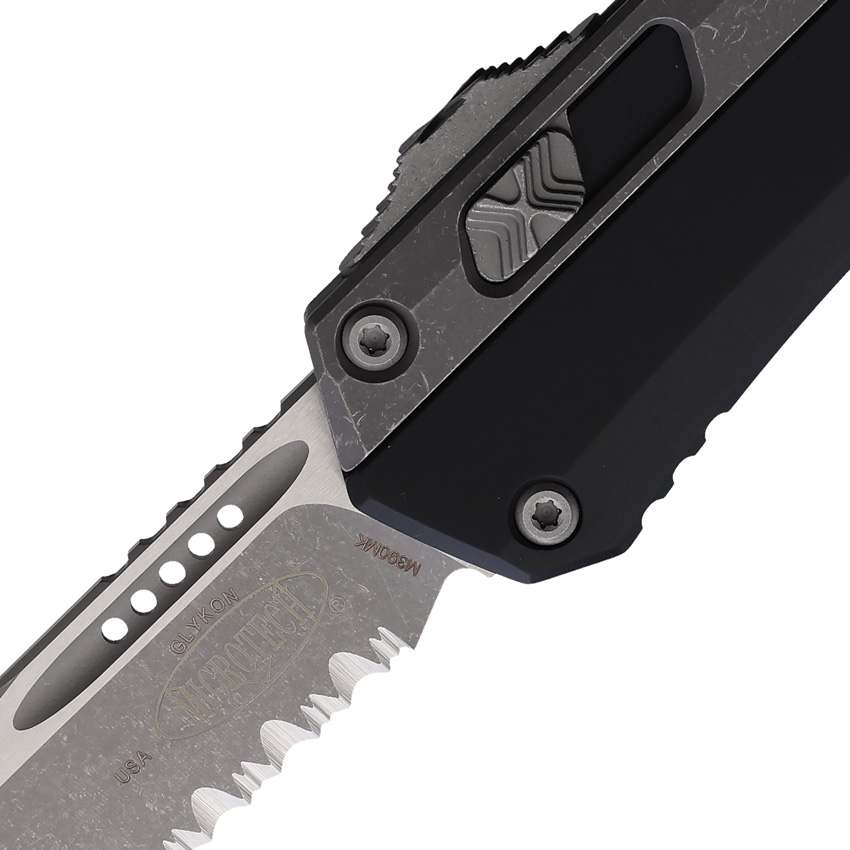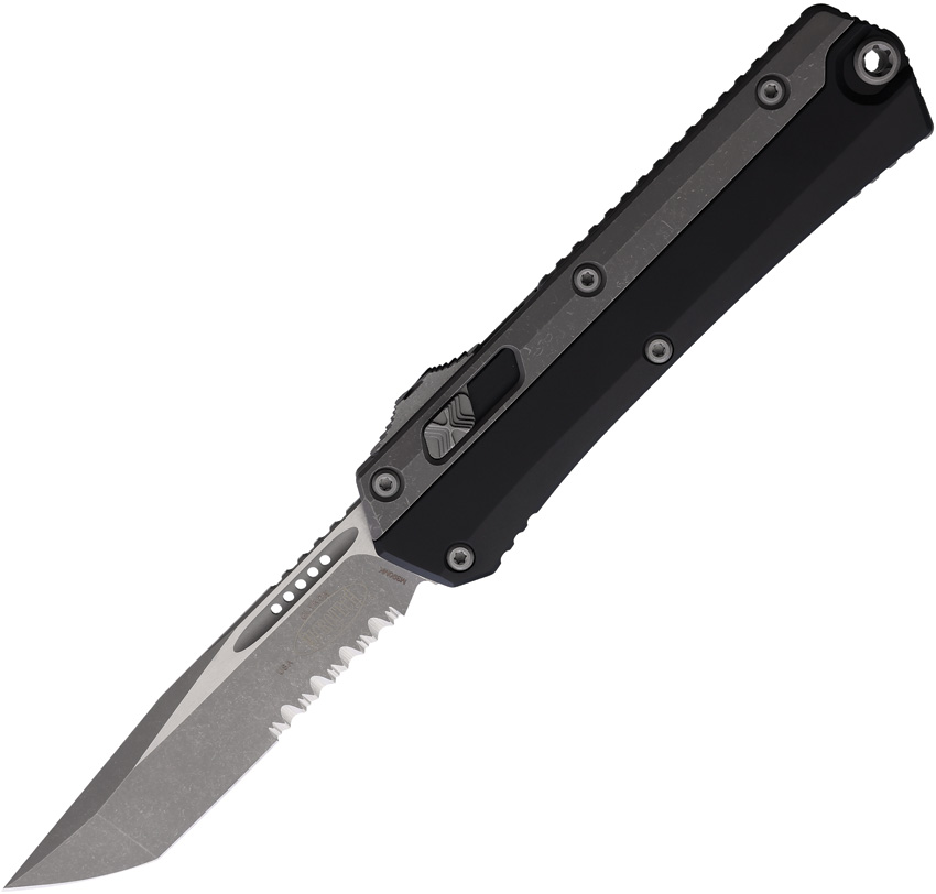 Automatic opening. 5.25″ (13.34cm) closed. 4″ (10.16cm) Apocalyptic finish partially serrated premium steel tanto blade. Pocket clip. Apocalyptic and black finish handle. Manual safety. Nickel boron internals. Boxed.