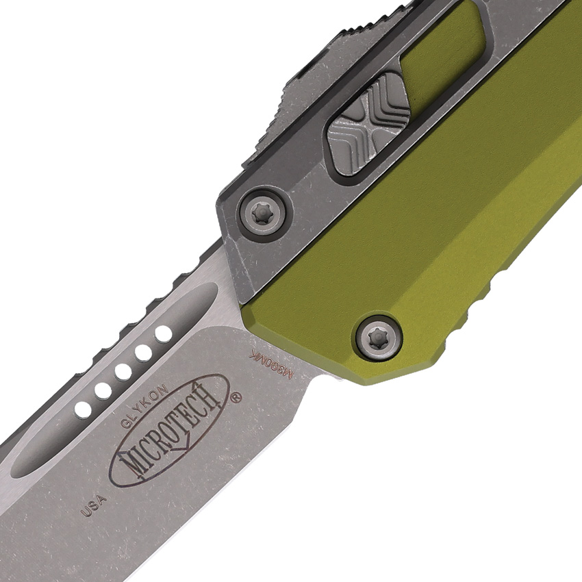 Automatic opening. 5.25″ (13.34cm) closed. 4″ (10.16cm) Apocalyptic finish premium steel tanto blade. Aluminum handle. Pocket clip. Apocalyptic and OD green finish handle. Manual safety. Nickel boron internals. Boxed.