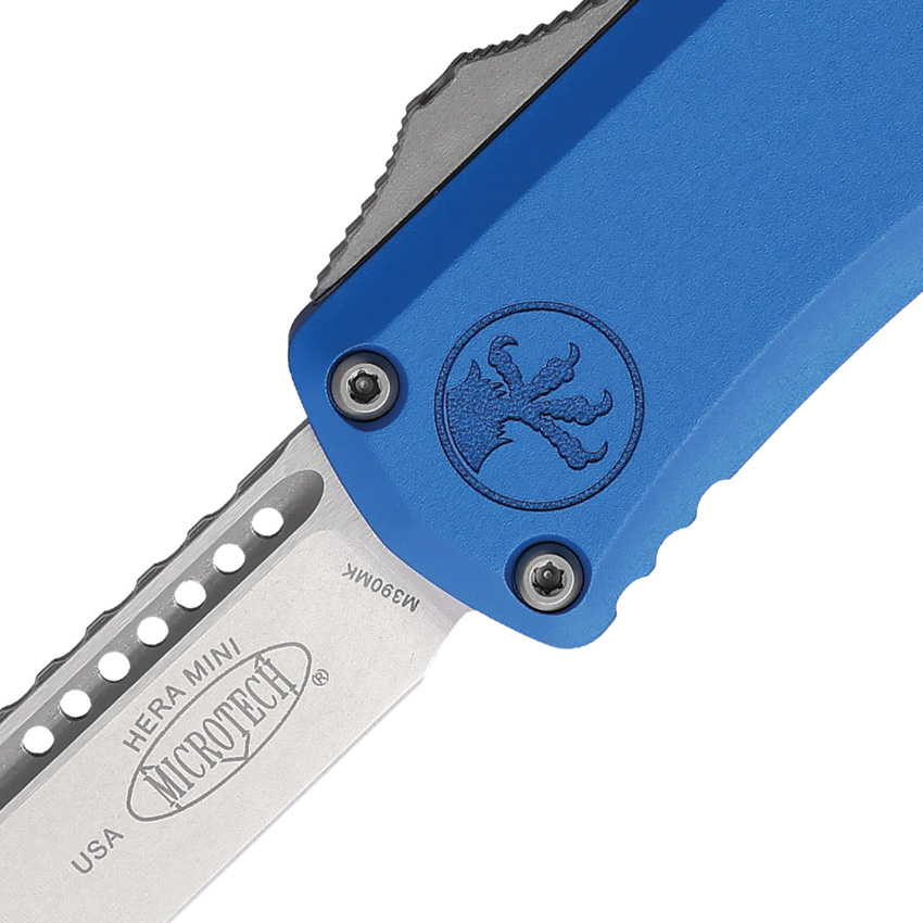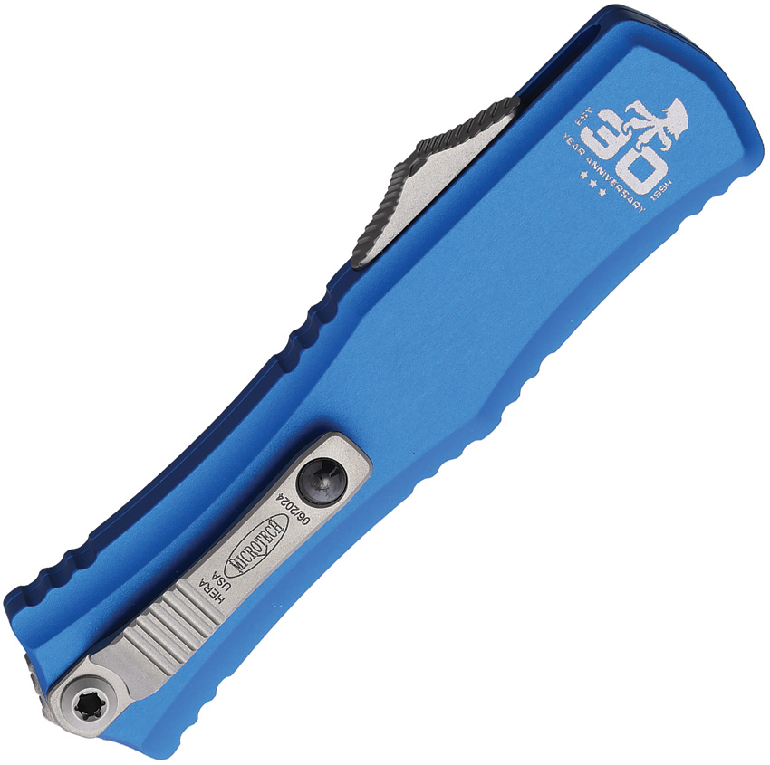 Automatic opening. 4″ (10.16cm) closed. 3″ (7.62cm) stonewash finish Bohler M390MK stainless blade. Blue aluminum handle. Pocket clip. Lanyard hole. Glass breaker. 30th anniversary edition. Boxed.