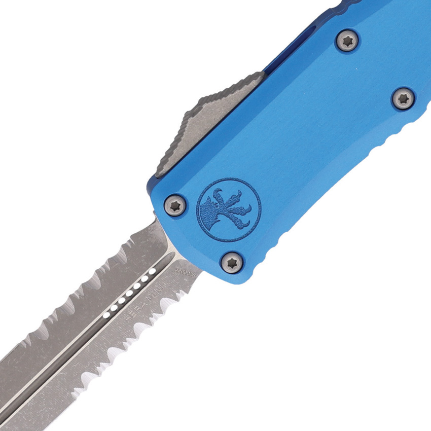 Automatic opening. 4″ (10.16cm) closed. 3″ (7.62cm) Apocalyptic finish partially serrated Bohler M390MK stainless dagger blade. Blue aluminum handle. Pocket clip. Lanyard hole. Glass breaker. Boxed.