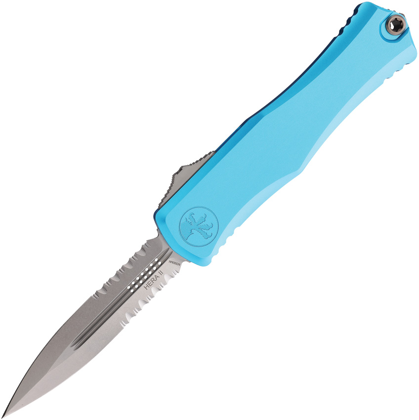 Automatic opening. 5.5″ (13.97cm) closed. 4″ (10.16cm) stonewash finish partially serrated premium steel blade. Turquoise aluminum handle. Pocket clip. Lanyard hole. Glass breaker. Double edge blade. Boxed.