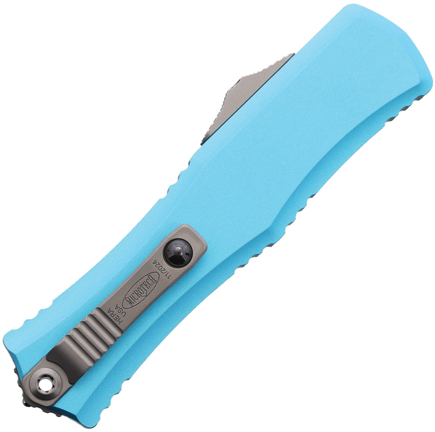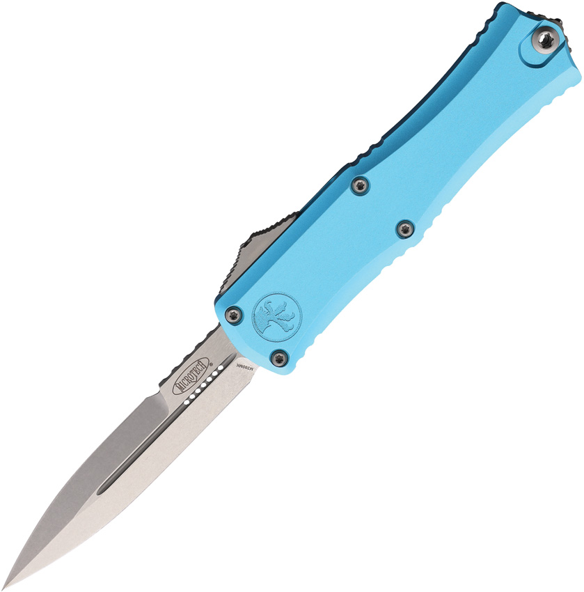 Automatic opening. 4″ (10.16cm) closed. 3″ (7.62cm) stonewash finish Bohler M390MK stainless blade. Turquoise aluminum handle. Pocket clip. Lanyard hole. Glass breaker. Bayonet style blade. Boxed.