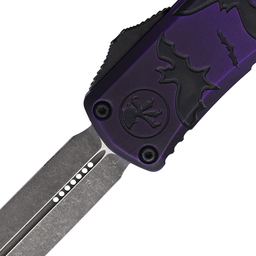 Automatic opening. 4″ (10.16cm) closed. 3″ (7.62cm) Apocalyptic finish double edge Bohler M390MK stainless dagger blade. Burgundy aluminum handle. Pocket clip. Lanyard hole. Glass breaker. Bat handle artwork. Boxed.