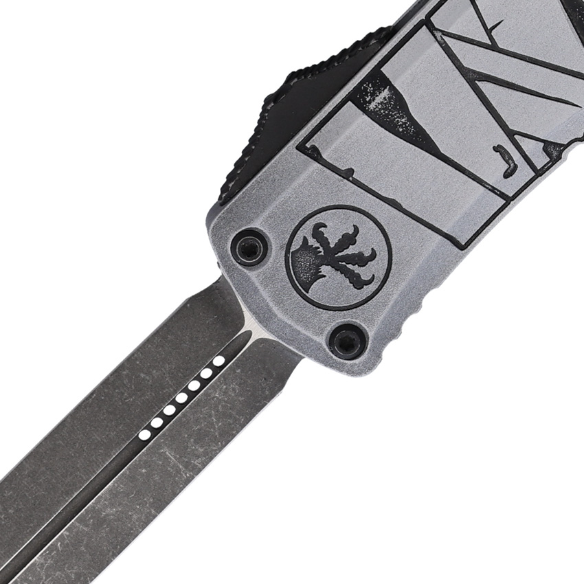 Automatic opening. 4″ (10.16cm) closed. 3″ (7.62cm) Apocalyptic finish Bohler M390MK stainless dagger blade. Gray aluminum handle. Pocket clip. Lanyard hole. Glass breaker. Mummy handle artwork. Boxed.