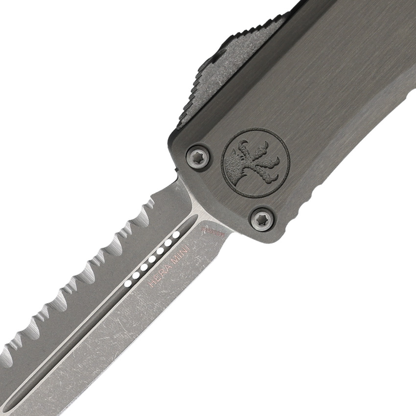 Automatic opening. 4″ (10.16cm) closed. 3″ (7.62cm) Apocalyptic finish serrated Bohler M390MK stainless dagger blade. Gray aluminum handle. Pocket clip. Lanyard hole. Glass breaker. Boxed.