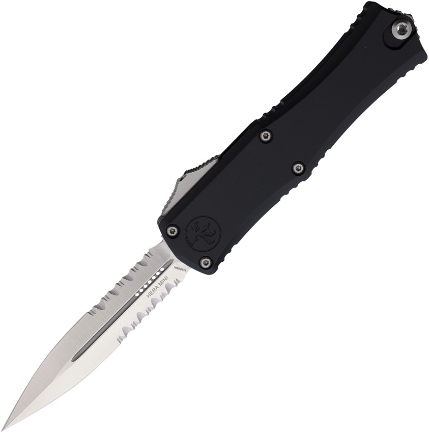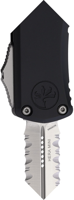 Automatic opening. 4″ (10.16cm) closed. 3″ (7.62cm) satin finish partially serrated Bohler M390MK stainless dagger blade. Black aluminum handle. Pocket clip. Lanyard hole. Glass breaker. Boxed.
