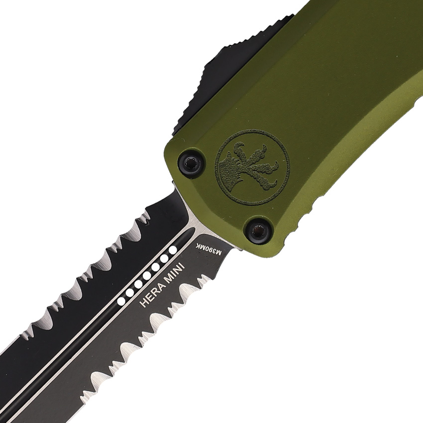Automatic opening. 4″ (10.16cm) closed. 3″ (7.62cm) two-tone finish partially serrated Bohler M390MK stainless dagger blade. OD green aluminum handle. Pocket clip. Lanyard hole. Glass breaker. Boxed.