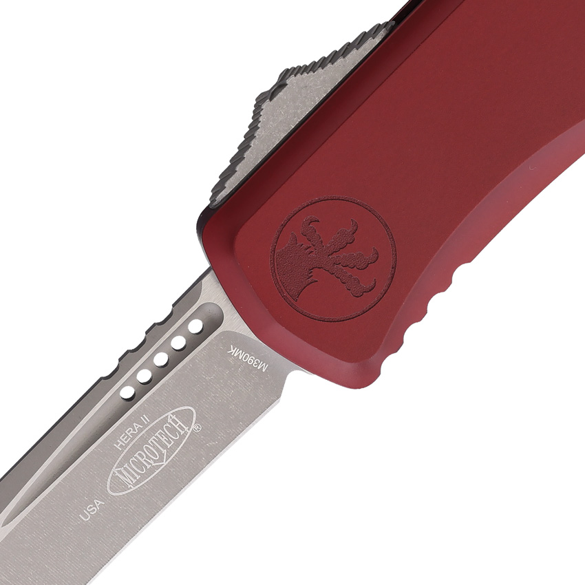 Microtech Knives Auto Hera II OTF Recurve Apoc, a premium automatic knife designed for the discerning user. With its apocalyptic finish and merlot aluminum handle, this knife is as stylish as it is functional. Expect superior performance and reliability from this USA-made product.
