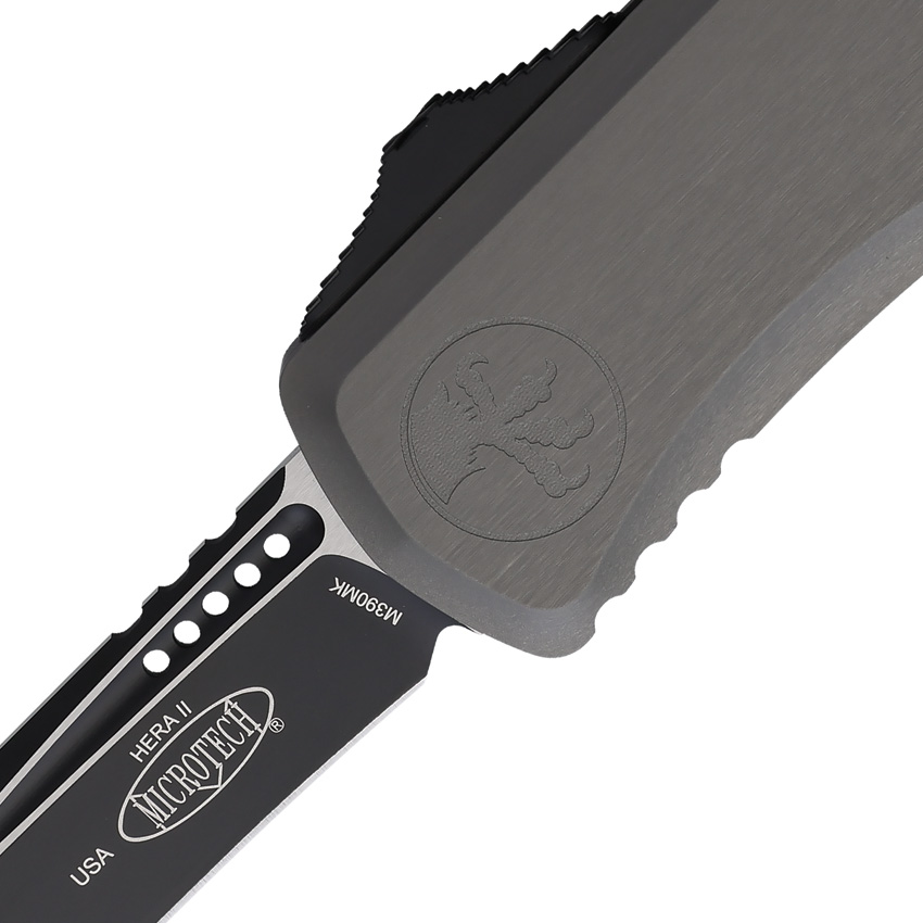 The Microtech Knives Auto Hera II OTF Recurve is an automatic knife that features a 4″” (10.16cm) two-tone finish Bohler M390K stainless steel blade. The gray aluminum handle ensures a firm grip, while the pocket clip, lanyard hole, and glass breaker add to its versatility. The knife comes boxed, making it a perfect gift for any outdoor enthusiast.