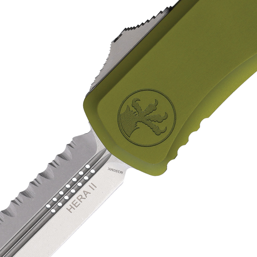 Automatic opening. 5.5″ (13.97cm) closed. 4″ (10.16cm) stonewash finish serrated Bohler M390MK stainless dagger blade. OD green aluminum handle. Pocket clip. Lanyard hole. Glass breaker. Double edge blade. Boxed.
