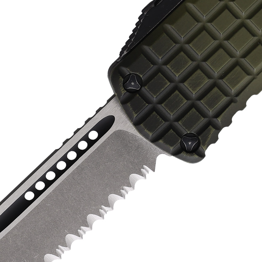 Automatic opening. 4.38″ (11.13cm) closed. 3″ (7.62cm) Apocalyptic finish serrated premium steel blade. Green aluminum handle. Pocket clip. Frag pattern handle. Boxed.