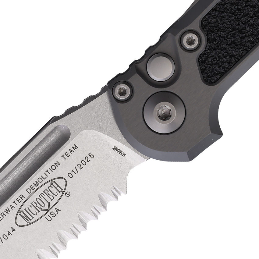 Automatic opening. 4.5″” (11.43cm) closed. 3.5″” (8.89cm) stonewash finish partially serrated Bohler M390MK stainless blade. Black aluminum handle with black traction insert. Lanyard hole. Pocket clip. Boxed.