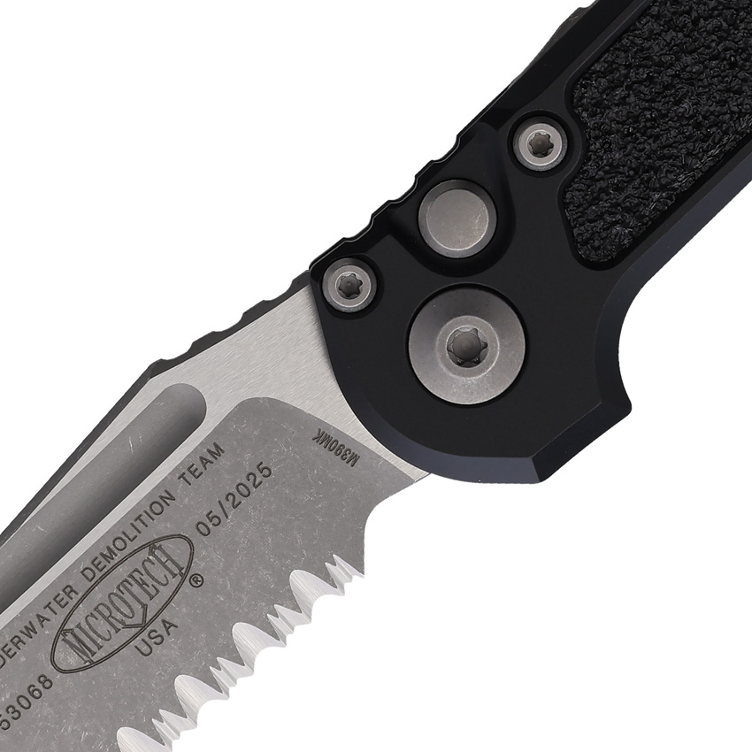 Automatic opening. 4.5″” (11.43cm) closed. 3.5″” (8.89cm) Apocalyptic finish serrated Bohler M390MK stainless tanto blade. Black aluminum handle with black traction insert. Lanyard hole. Pocket clip. Boxed.