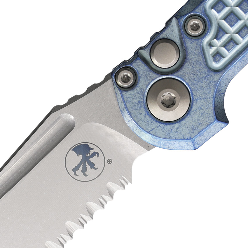Automatic opening. 4.5″ (11.43cm) closed. 3.5″ (8.89cm) stonewash finish partially serrated Bohler M390MK stainless tanto blade. Ice blue frag pattern titanium handle. Pocket clip. Lanyard hole. Double vapor blast stainless hardware. Boxed.