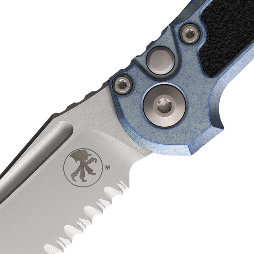 Automatic opening. 4.5″ (11.43cm) closed. 3.5″ (8.89cm) stonewash finish partially serrated Bohler M390MK stainless tanto blade. Ice blue titanium handle with black traction insert. Pocket clip. Lanyard hole. Double vapor blast stainless hardware. Boxed.