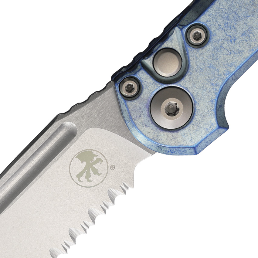 Automatic opening. 4.5″ (11.43cm) closed. 3.5″ (8.89cm) stonewash finish partially serrated Bohler M390MK stainless clip point blade. Ice blue titanium handle. Lanyard hole. Pocket clip. Blue titanium and double vapor blast stainless accents. Boxed.
