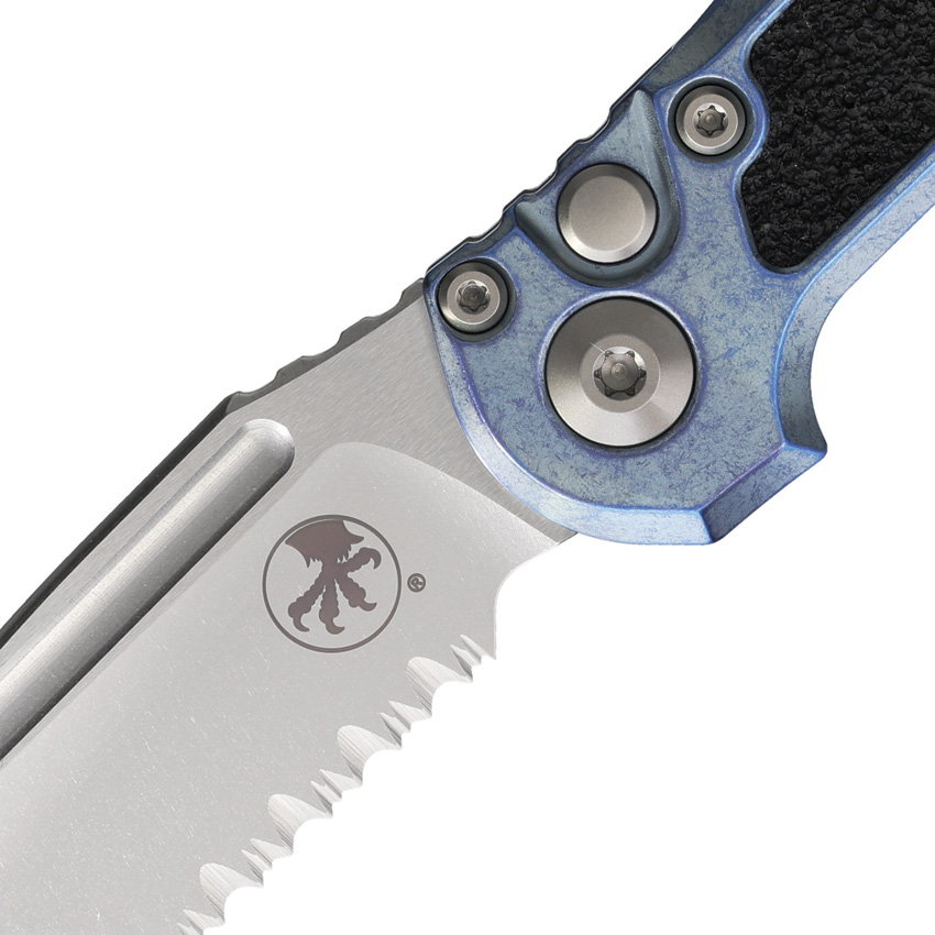 Automatic opening. 4.5″ (11.43cm) closed. 3.5″ (8.89cm) stonewash finish partially serrated Bohler M390MK stainless clip point blade. Ice blue anodized titanium handle with black traction insert. Lanyard hole. Pocket clip. Double Vapor Blast accents. Boxed.