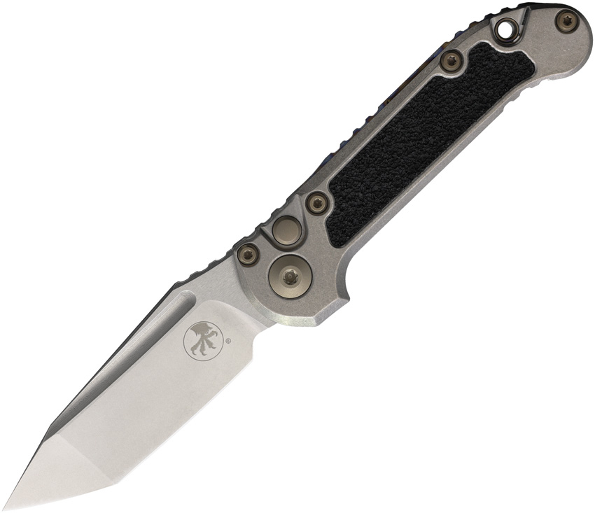 Automatic opening. 4.5″ (11.43cm) closed. 3.5″ (8.89cm) stonewash finish Bohler M390MK stainless tanto blade. Gray stonewash finish titanium handle with black traction insert. Pocket clip. Lanyard hole. Flamed titanium accent. Bronze double vapor blast stainless hardware. Boxed.