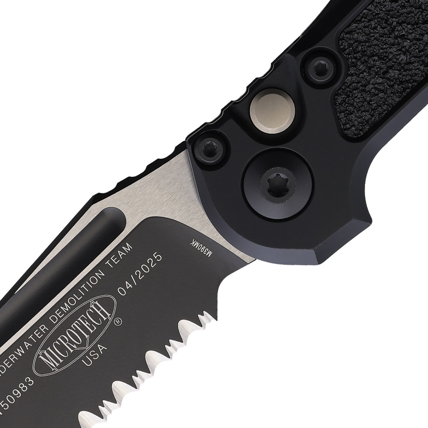 Automatic opening. 4.5″” (11.43cm) closed. 3.5″” (8.89cm) two-tone finish partially serrated Bohler M390MK stainless tanto blade. Black aluminum handle with black traction insert. Lanyard hole. Pocket clip. Boxed.