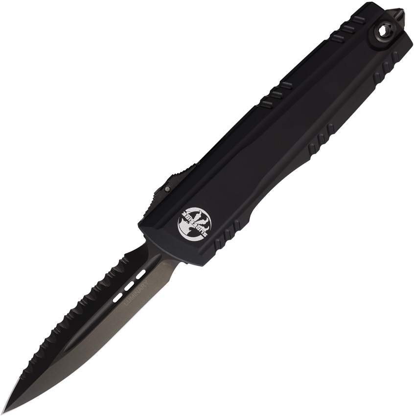 Automatic opening. 5″ (12.7cm) closed. 3.5″ (8.89cm) black DLC coated serrated Bohler M390MK stainless dagger blade. Black DLC coated aluminum handle. Glass breaker. Lanyard hole. Pocket clip. Tritium button insert. Boxed.