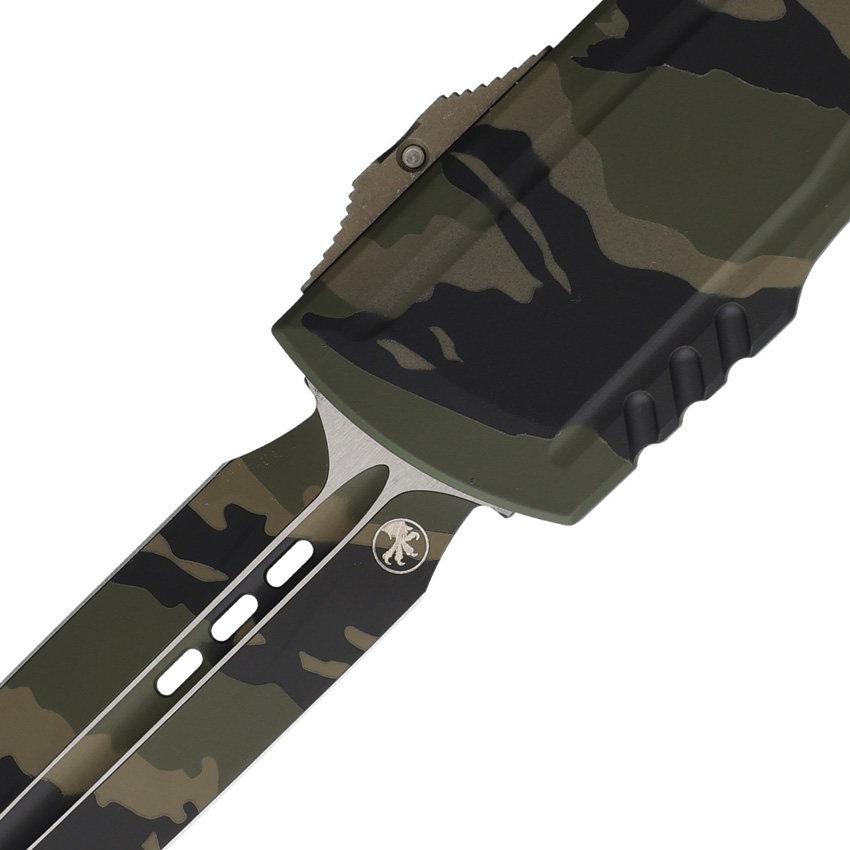 Automatic opening. 5″ (12.7cm) closed. 3.5″ (8.89cm) double edge Bohler M390MK stainless dagger blade. Aluminum handle. Glass breaker. Lanyard hole. Pocket clip. Tritium button insert. Tiger Stripe camo blade and handle. Boxed.