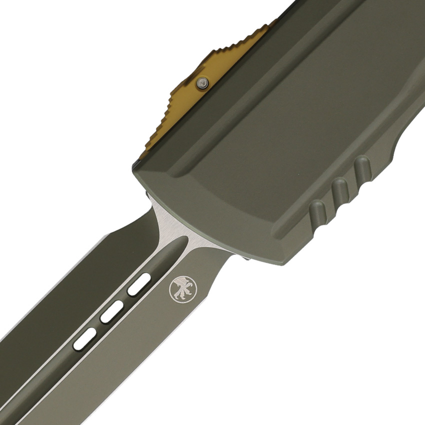 Automatic opening. 5″ (12.7cm) closed. 3.5″ (8.89cm) double edge Bohler M390MK stainless dagger blade. Aluminum handle. Glass breaker. Lanyard hole. Pocket clip. Tritium button insert. Moss green blade and handle. Boxed.