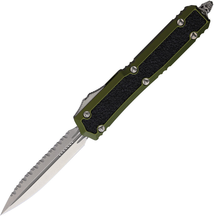 Automatic opening. 5.13″” (13.03cm) closed. 3.38″” (8.59cm) stonewash finish serrated stainless dagger blade. OD green aluminum handle with black textured insert. Glass breaker. Lanyard hole. Pocket clip. Double edge blade. Nickel Boron internals. Boxed.